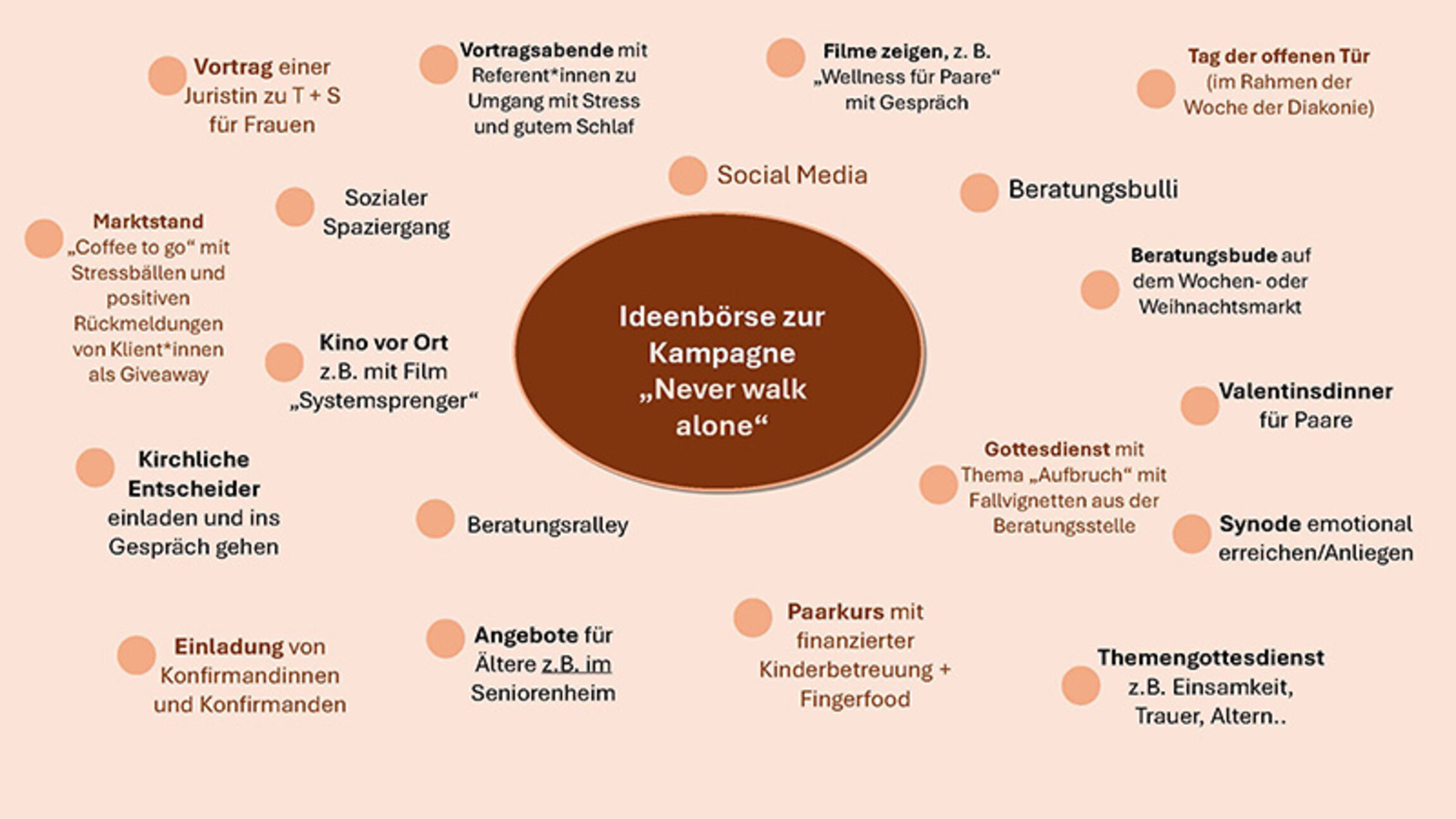 „Die Psychologische Beratung ist ein hervorragendes Angebot, das niedrigschwellig mitten in die Gesellschaft hineinwirkt und wichtige Arbeit leistet“, sagt Angela Grimm, Direktorin des Zentrums für Seelsorge und Beratung. „Gleichzeitig ist die Beratungsarbeit, wie die Seelsorge auch, eher leise und auf den ersten Blick für die kirchliche und außerkirchliche Öffentlichkeit nicht so sichtbar wie andere Bereiche kirchlichen Lebens.“ An dieser Stelle setzt „Never Walk Alone“ an: Psychologische Beratung in kirchlicher Trägerschaft soll sichtbarer, hörbarer und erlebbar werden. Gleichzeitig ist es das Ziel, die Beratungsarbeit noch stärker als bisher mit anderen lokalen Akteur*innen zu vernetzen: diakonischen und kommunalen Einrichtungen, Gemeinwesenarbeit, Kindertagesstätten, Schulen, Gesundheitsfürsorge.
