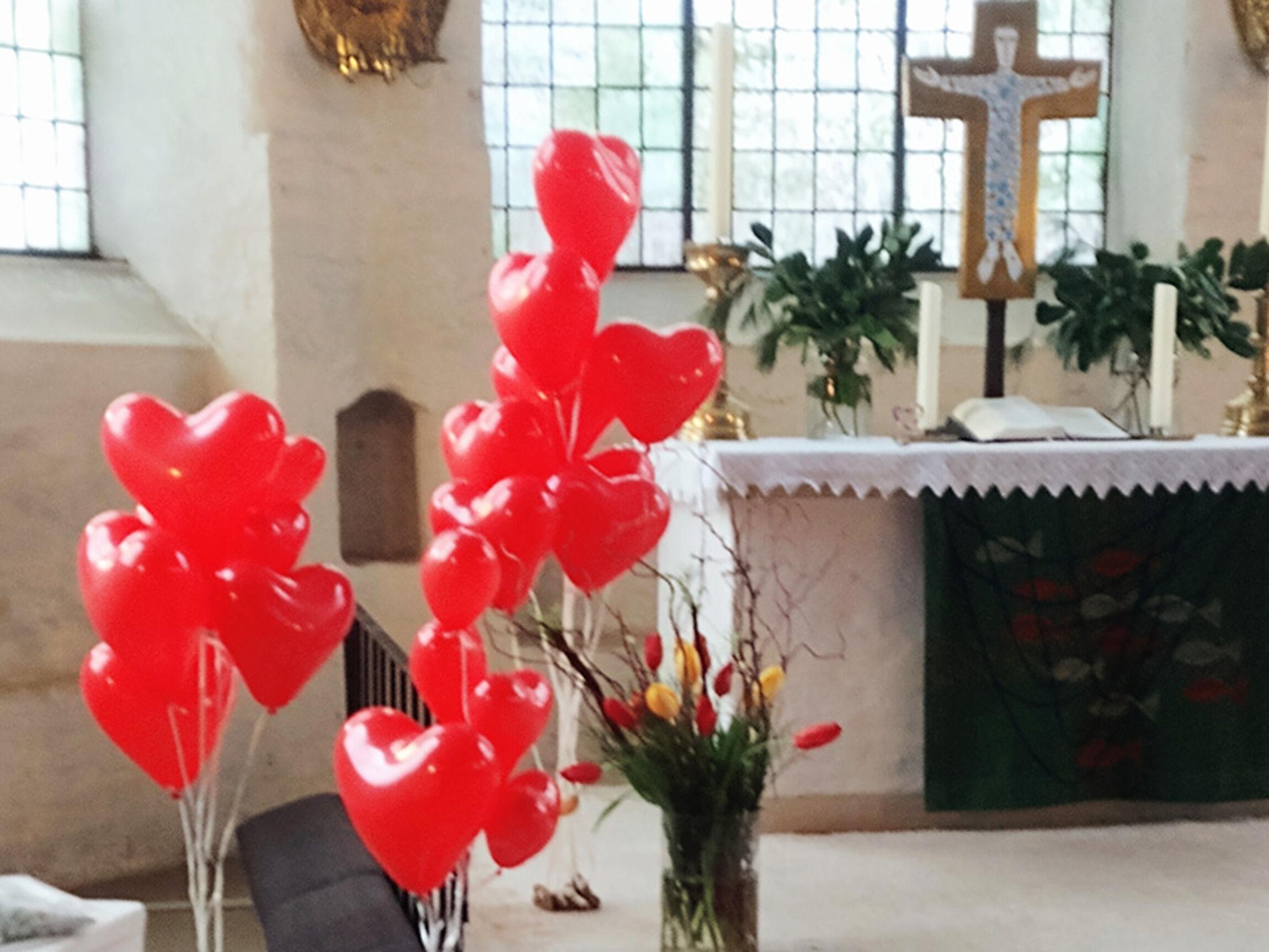 Der Altarraum, in dem zwölf Paare Platz genommen hatten, war unter anderem mit Herzluftballons geschmückt und die Kirchenband der St.-Peter-und-Paul-Gemeinde spielte Lieder rund um die Liebe; schnell entstand so eine vertrauensvolle Atmosphäre. Krönender Abschluss war schließlich ein Valentinsdinner, das an geschmückten Tischen im Gemeindesaal serviert wurde.