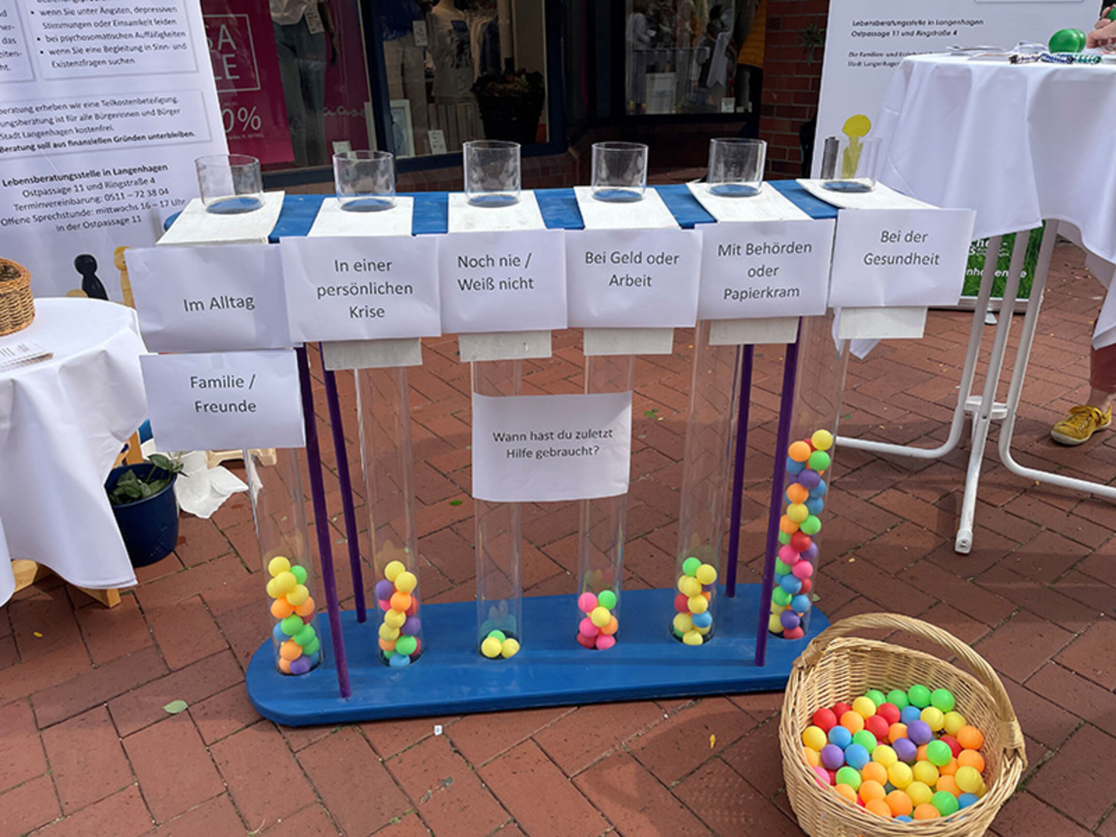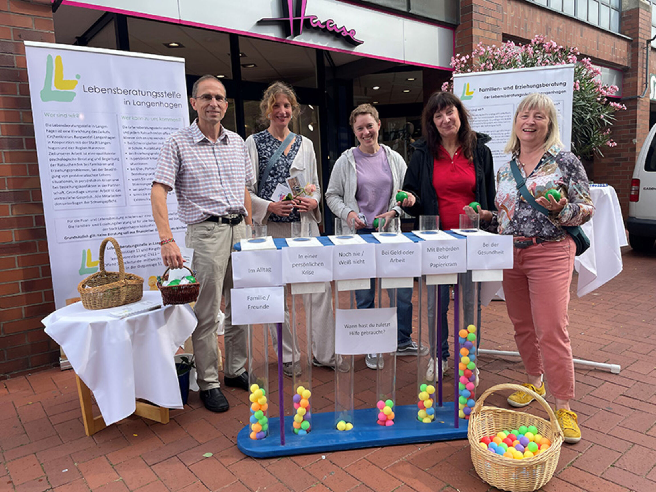 Ein Stand auf dem Wochenmarkt im Stadtzentrum bot den Mitarbeitenden der Lebensberatungsstelle in Langenhagen die Möglichkeit, einige ihrer Angebote vorzustellen. Mitarbeitende aus der Psychologischen Beratung und aus der Verwaltung der Einrichtung kamen so mit vielen Menschen ins Gespräch und erfuhren dabei viel Anerkennung von ihren Gesprächspartner*innen; auch Dankbarkeit für die Möglichkeit, Beratung vor Ort nutzen zu können.